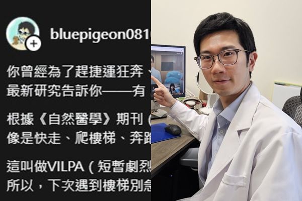 知名網紅醫師、YouTuber蒼藍鴿(本名吳其穎)除了本業以外,也相當認真經營社群,24日他在Threads上引用了《自然醫學》期刊中的最新研究,指出日常中的短暫卻高強度的活動,其實都可以對健康產生正面影響。研究發現,只要每天進行3次、每次約1至2分鐘的劇烈身體活動,像是快步走路、飛奔上下樓梯,甚至趕公車等,都有助於降低心血管疾病風險,並減少整體死亡率。