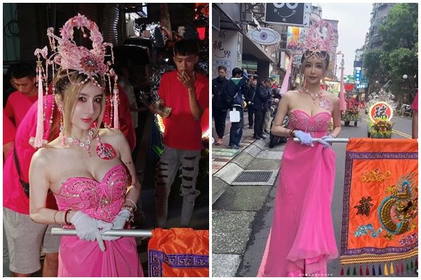 雪碧透過社群平台曬出活動照片,只見她頭戴華麗粉色頭飾,身穿典雅粉色禮服,手持神轎旗幟站在隊伍前方,散發出仙氣十足的氣場。低胸設計的禮服完美突顯她的傲人身材曲線,展現出自信與魅力,讓粉絲們大飽眼福。