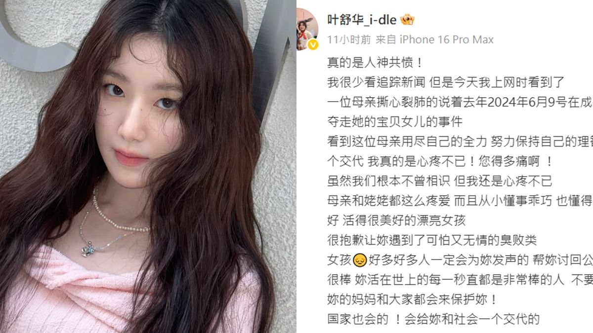 I-DLE成員舒華相隔一年在微博發文,28日凌晨針對2024年6月發生於中國成都的王某雅命案發聲,強調「我用我公眾人物的身份來和大家說,請重視這個事件」,全文情緒飽滿,呼籲社會關注司法正義,替受害者與家屬討回公道。