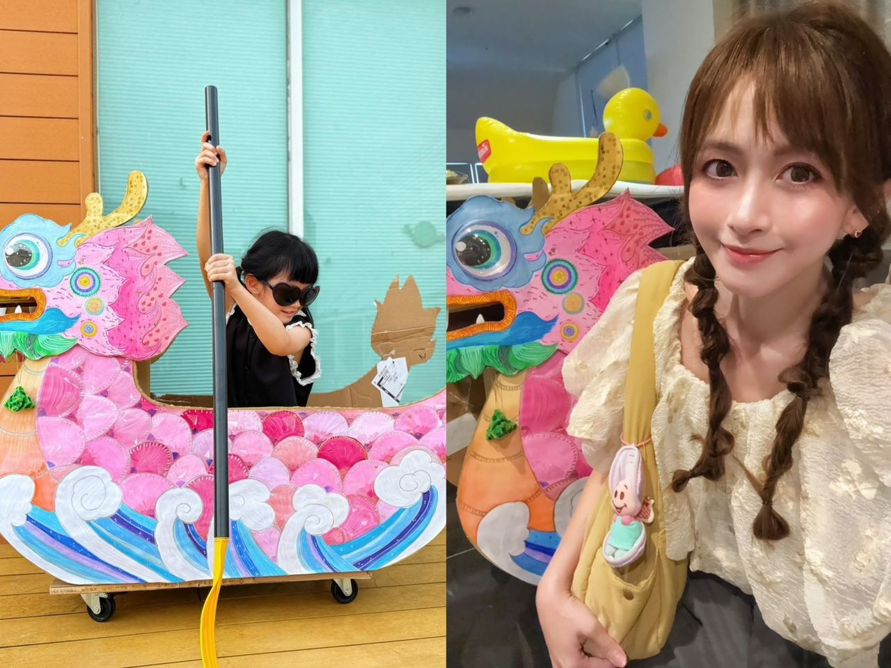 ▲ 馮媛甄和女兒一起完成「粉紅紙箱龍舟」。(圖/翻攝自Facebook/ 馮媛甄Abby Feng)