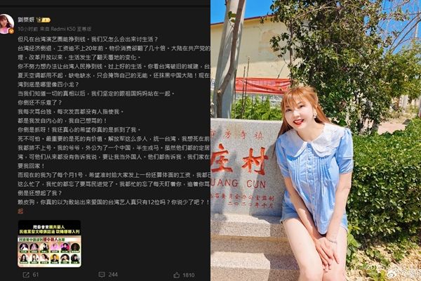 民進黨中國事務部近日在社群平台發文,提及包括劉樂妍在內的12位疑似親中藝人,引發討論。雖然政府官方尚未公布調查名單細節,但劉樂妍1日在微博發文開轟,「但凡在台灣演藝圈能掙到錢,我們又怎麼會出來討生活?」痛批台灣經濟衰退、人民生活困苦,並認為「大陸在共產黨的治理之下發生了翻天覆地的變化」,強調自己支持中國是「發自內心的」,而非受人指使。