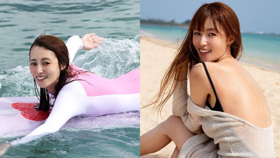 此外,透過先行公開的照片可見到,深田恭子穿著一件淺色上衣,上衣微微滑落,露出她的肩膀與美背,內搭黑色細肩帶泳衣,完美襯托性感氣質。在其他照片中,深田恭子身穿粉紅和白色相間的長袖泳衣,她趴在衝浪板上,身體微微向上抬起,臉上露出燦爛的笑容,顯得非常開心與放鬆,完美展現她健康及自信的一面。