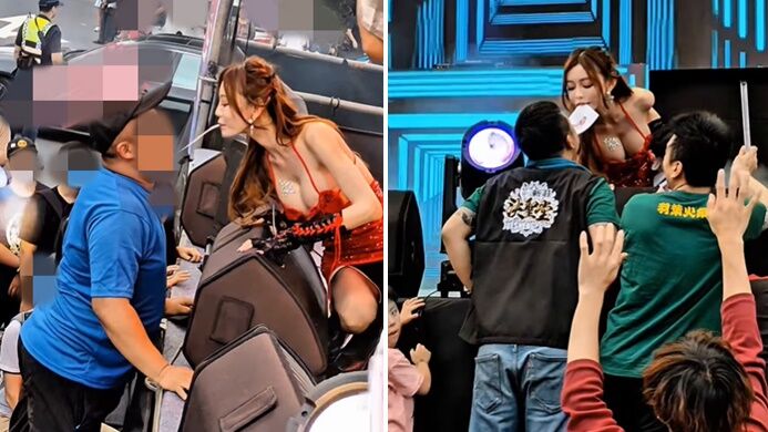 長瀨昆妮不只答應,還換了新戰袍上台。只見她穿著紅色貼身短洋裝,重點部位只遮兩塊愛心布料,豐滿上圍完全包不住,更不用說還穿吊帶襪,造型火辣程度破表,最後甚至用嘴巴叼東西送給粉絲,「再次現場大失控」,可說是誠意十足,「新莊一年一度盛事圓滿結束。」