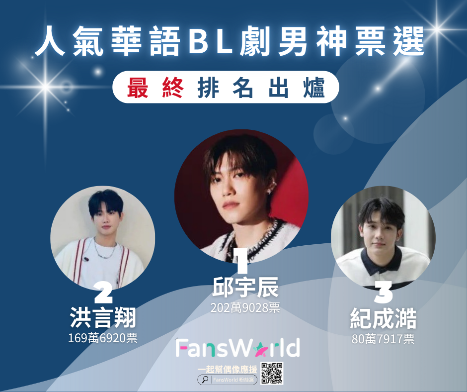 由台灣最大粉絲應援平台「FansWorld粉絲窩」主辦的《人氣華語BL劇男神票選》活動結果正式揭曉!歷時數週的激烈拉票戰,吸引成千上萬粉絲踴躍投票應援,話題熱度居高不下,最終由邱宇辰氣勢如虹奪下冠軍寶座,成功登頂「人氣BL劇男神」第一名,洪言翔、紀成澔位列第2、3名。