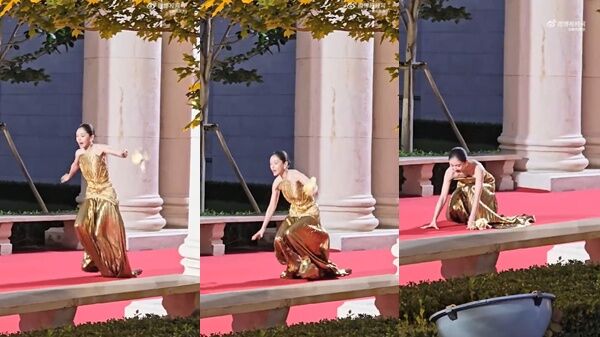 從畫面可見,王子文身穿金光閃閃的貼身禮服,手拿小巧手包,儀態優雅地走在紅毯上。然而,期間她疑似裙擺過長導致踩步不順,她突然身體向前傾倒,瞬間雙膝跪地、雙手撐地,整個人幾乎伏地摔趴。雖然瞬間驚險萬分,但她隨即迅速起身整理禮服,恢復氣場,展現敬業與大方。