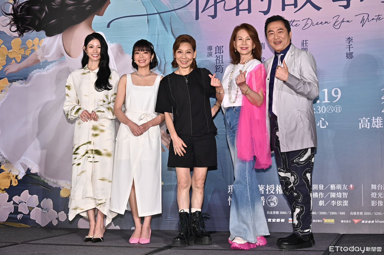 ▲瓊瑤原著改編《你的故事我的夢》舞台劇記者會,(左起)李千娜、林雨宣、導演郎祖筠、周丹薇、湯志偉。(圖/記者李毓康攝)
