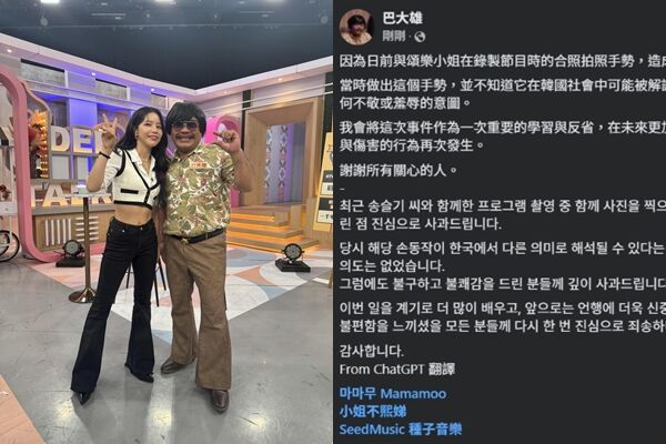 歌手巴大雄因一首〈可不可以放進去一下下就好〉而爆紅,前陣子剛推出新歌的他,近日登上《小姐不熙娣》宣傳,與正在宣傳中文單曲的MAMAMOO頌樂同台,節目錄製結束後,兩人開心合照,不過事後他將照片上傳到臉書時,內文卻出現令許多粉絲不滿、疑似「性騷擾」的內容,因而遭出征,20日晚間他為此發布了中韓文版本的公開致歉文。