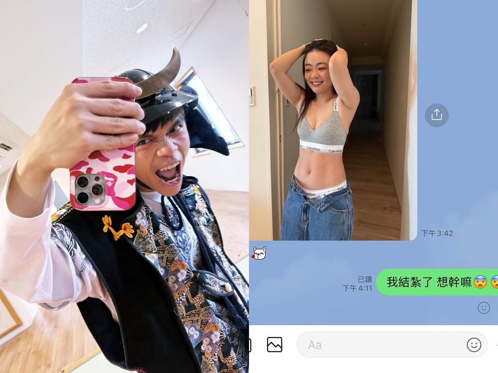 蔡阿嘎昨日曬出LINE對話截圖,配文寫道:「欸等等,嘎哥還在日本拍片啊!想幹嘛?」截圖中,老婆二伯傳來一張身穿CK運動內衣、下身搭配解開鈕扣的牛仔長褲的照片,辣挺雙峰、露出深邃事業線及腹部線條。他回覆兩個驚訝表情圖示回應:「我結紮了,想幹嘛。」