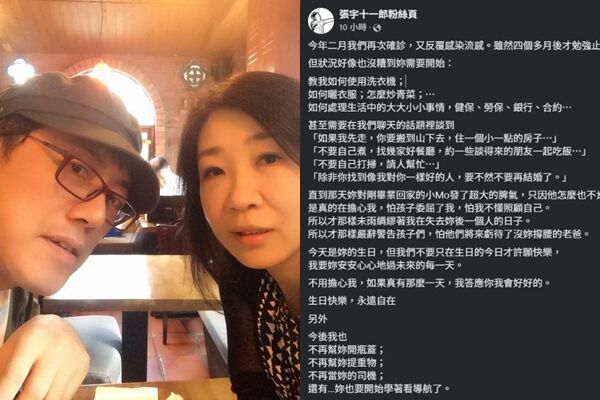 歌手張宇21日罕見在臉書曬出與妻子、詞曲製作人十一郎(蕭慧文)的甜蜜合照,為的是替摯愛慶生。他感性發文祝福58歲的太太生日快樂,同時也吐露出心中最深的牽掛,透露十一郎因病纏身,近來身體狀況欠佳,甚至貼心交代了一連串類似「遺言」的安排,讓不少粉絲看了心疼不已。