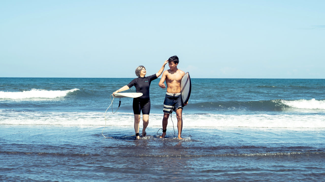 ▲楊貴媚在《喝酒吧!笨蛋》影集中與鮮肉小男友,經常一起去衝浪放閃。(圖/逆光電影提供)