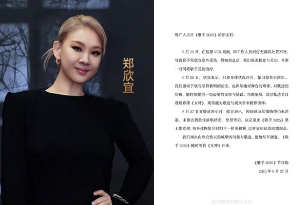 《歌手2025》以不修音、全開麥方式直播,新一季的參戰歌手多以樂壇新生代為主,對比最初網傳的大咖陣容被批評落差甚大。節目27日播出第7集,找來香港星二代歌手鄭欣宜當補位歌手之一,這是她神隱兩年首度公開露臉,然而就在節目播出前,電視台卻突發公告,表示鄭欣宜在拍攝宣傳影片期間不慎受傷,最終決定退賽,讓眾多期待她復出的歌迷錯愕又不捨。
