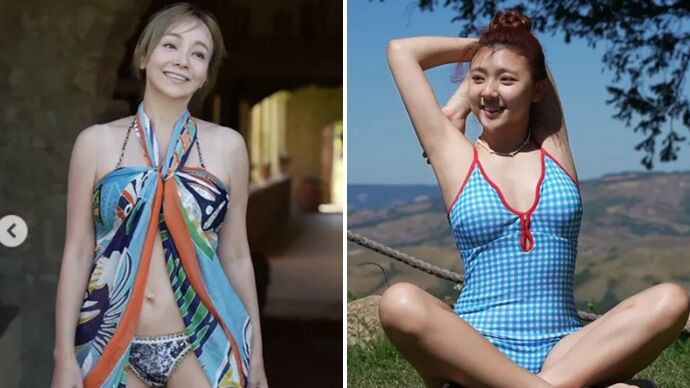 ▲樂樂解放前後開深V的泳裝。(圖/翻攝自Instagram/olivia_wang_1119)