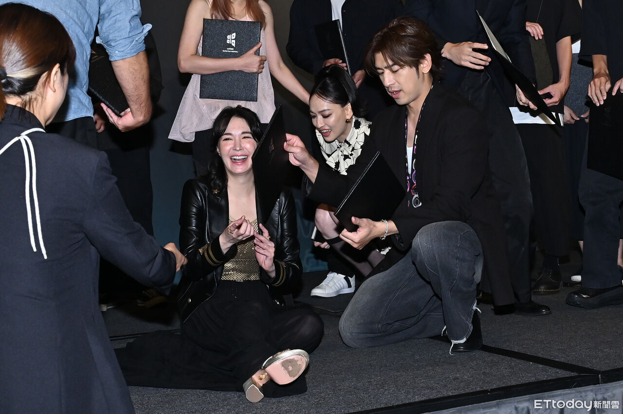 ▲張榕容因裙擺過長,數度腳步踉蹌,甚至直接坐倒在地上,陳柏霖及姚以緹紛紛上前攙扶。(圖/記者李毓康攝)
