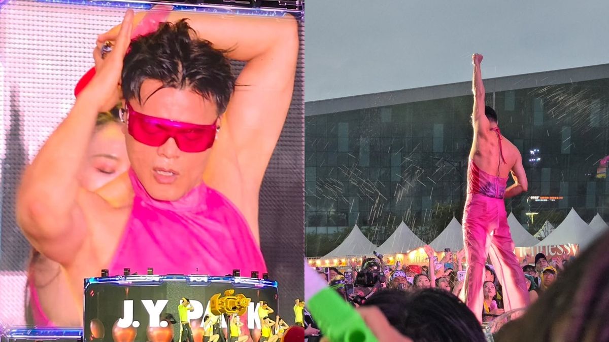南韓知名歌手兼製作人朴軫永(J.Y. Park),日前登上WATERBOMB,再次以他標誌性的突破造型與熱力舞蹈掀起全場高潮。他身穿一襲高領綁帶式的粉紅色透視連身裝,在大雨中賣力演出,全場粉絲熱情回應、氣氛沸騰。