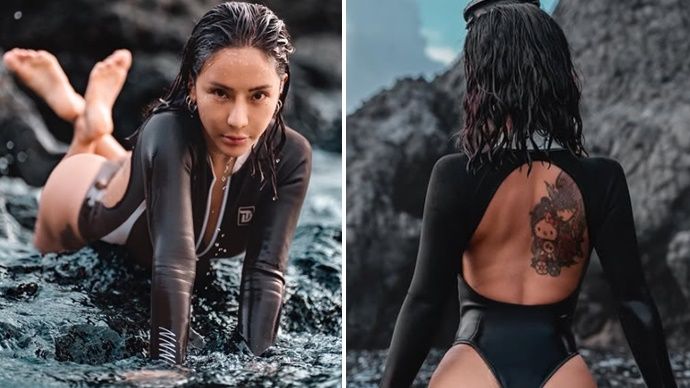 照片中,可以看到梁云菲身穿一件黑色長袖潛水防寒衣,以黑色為主調,側邊拼接白色線條,勾勒出流線型的身形輪廓;胸前配有拉鍊設計,從領口開至胸前,展現微微性感卻不失俐落感。