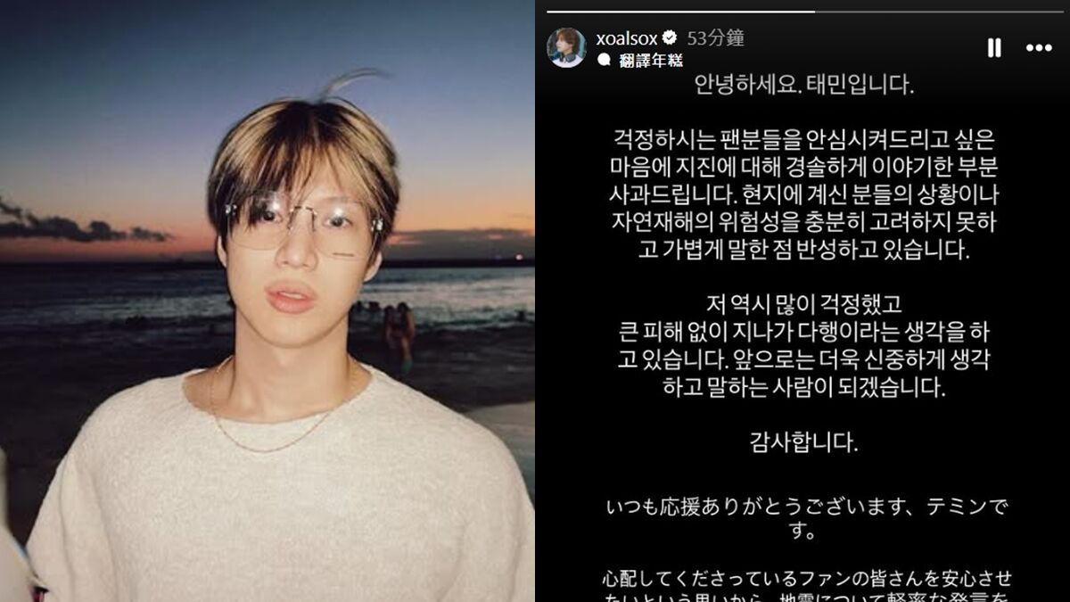 韓團SHINee成員泰民,5日在Instagram直播中提到「日本地震預言」時,說若在演出中遇上說不定會有特殊舞台效果,用詞失當引發爭議,隨後他在6日透過限時動態向粉絲及大眾表達歉意。