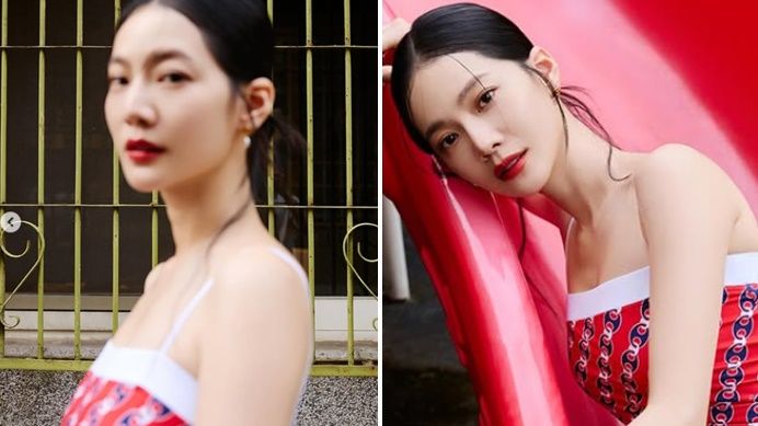 照片中,可以看到曾之喬身穿一件紅底藍白印花的連身泳裝,相當映襯她的白皙膚色,剪裁俐落合身,格外襯托出纖細的肩頸線條與身形比例。