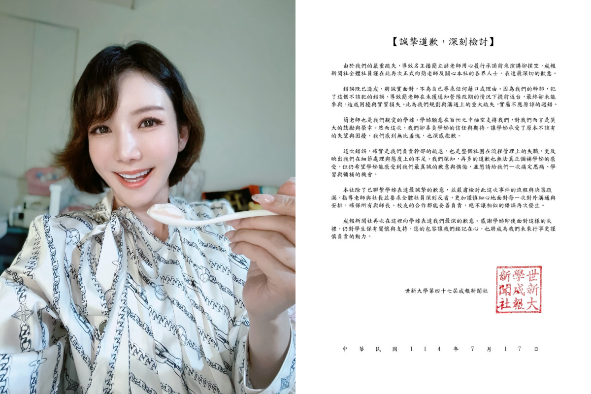 媒體人簡立喆昨(16)日在社群透露被母校世新大學的學弟妹們放鴿子,明明半年前就已經答應邀請要擔任講師,但到場卻被告知「活動提早辦完了」,她為此發文表示「失望又錯愕」。對此,成報新聞社17日也發表正式聲明,坦承確有疏失並向簡立喆道歉。