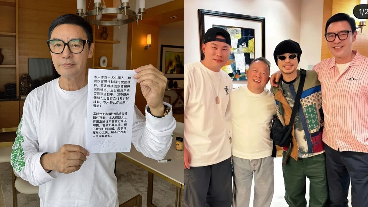 港星鍾鎮濤與曾志偉近日赴馬來西亞雲頂出席活動,並與當地歌手黃明志在公開場合合影,黃明志隨後將合照上傳社群平台,寫下「祝今晚演出成功 #超級無敵獎門人 #曾志偉 #鍾鎮濤」。然而,鍾鎮濤20日下午突發聲明,嚴正切割,表示與黃明志合影「屬無心之失」,澄清自己並不知情對方立場。