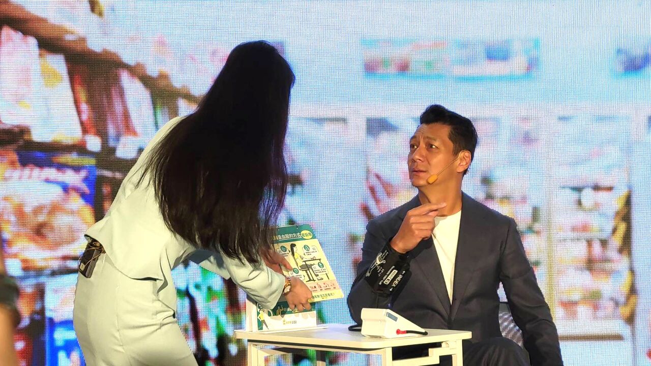 ▲聶雲(右)聽力出現問題,跟主持人比手畫腳。(圖/記者葉文正攝)