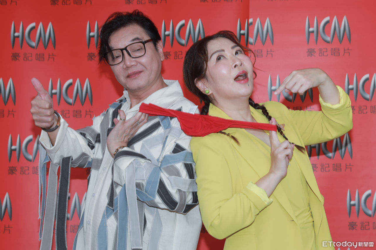有「南霸天歌王」封號的台語歌手七郎,入行39年首度換新東家,加盟豪記唱片並推出新專輯《南國之戀》,今(23日)舉辦記者會,和他合唱〈娘子牽情郎〉,同門「師姐」張秀卿還特別送上紅內褲當作賀禮,搞笑說有特別選XL號,原本現場要拱七郎穿紅內褲,但張秀卿則大膽把紅內褲又是掛在他耳朵,一下又圍在脖子,打趣說「你看剛剛好,我真的有選對尺寸。」