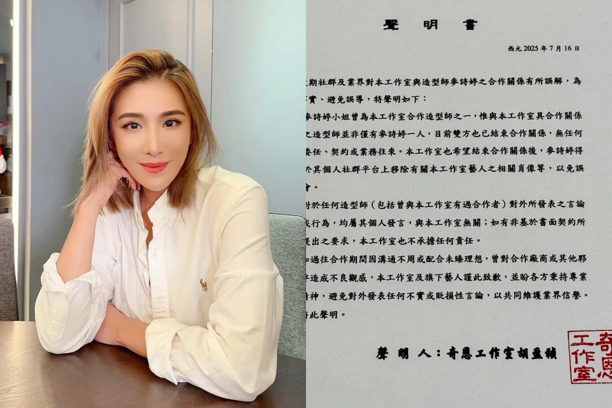 聲明中,胡小禎指出造型師麥詩婷曾是她工作室合作的造型師之一,但並非只有對方一人,「目前雙方也已結束合作關係,無任何委任、契約或業務往來。本工作室也希望結束合作關係後,麥詩婷得於其個人社群平台上移除有關本工作室藝人之相關肖像等,以免誤會。」
