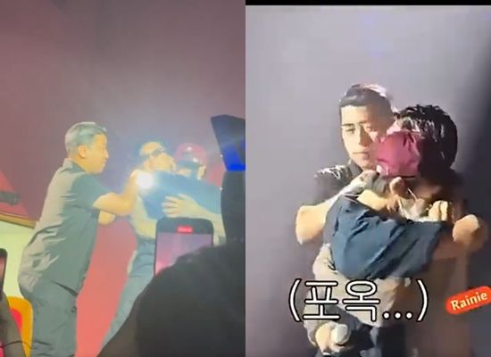 原來這名衝上台的紅帽男是Super Junior成員東海,但他當時除了戴帽,還戴著口罩,遮擋住大半張臉,一上台就緊緊抱住WINNER成員李昇勳,保鑣誤以為他是瘋狂私生飯,趕緊上前將他拉走,甚至一度警戒處理,幸好東海的經紀人迅速介入解釋,才讓保鑣放手並連連道歉,畫面PO網後笑翻大批粉絲。
