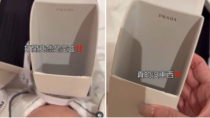 周品均7日在社群網站上傳開箱影片,原本想分享在米蘭買的PRADA墨鏡,結果打開竟然是空盒,「不是第一次拿到空盒,拆開那瞬間真的整個傻眼!」