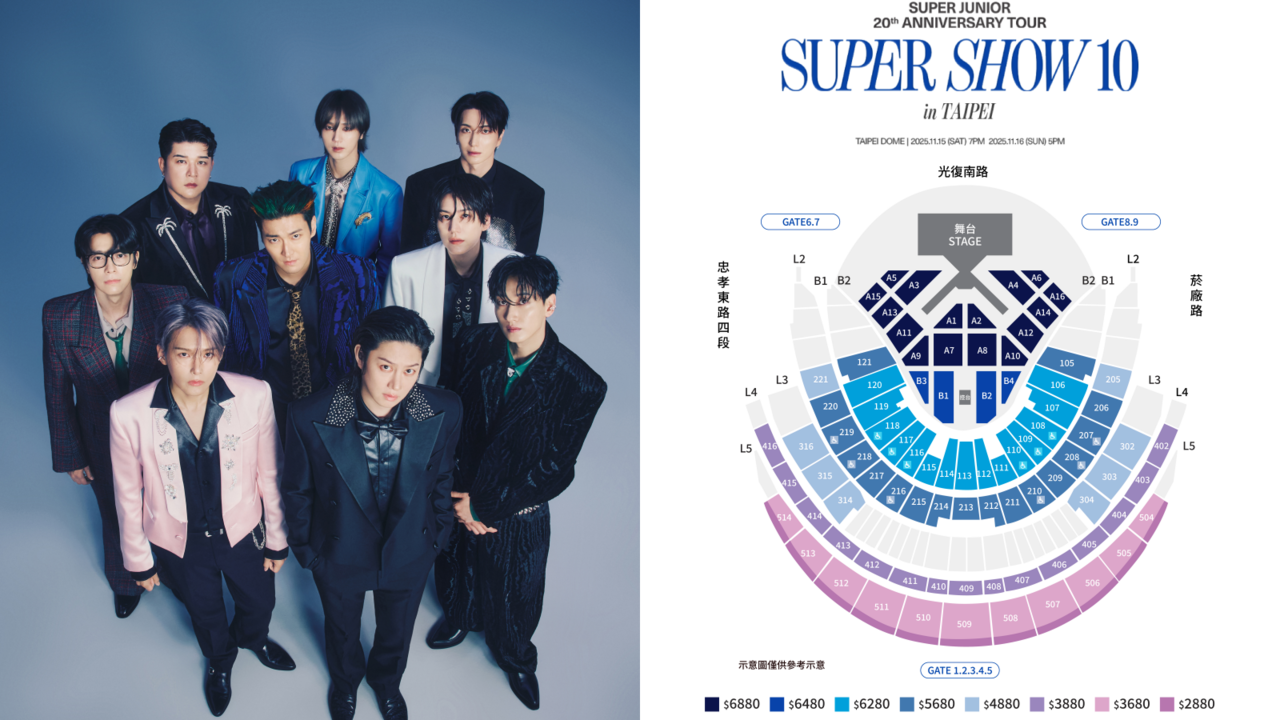 這段長達20年的旅程,如今進入嶄新篇章。Super Junior正式啟動20週年「SUPER SHOW 10」巡迴演唱會,台北站預計在11月15、16日於臺北大巨蛋盛大舉辦,團員過去數度誓言「挑戰大巨蛋」,該指標性的場地對9人來說頗有象徵性。演唱會售票訊息於20日正式公開,票價分為6880、6480、 6280、5680、4880、3880、3680、2880元,其中6880票價區可享有SOUNDCHECK福利,門票分為三階段購票,8月28日13點到22點為E.L.F. MEMBERSHIP會員搶先預購(此階段必須先在官咖會員上登記購票),再來是國泰世華CUBE卡友於8月29日13點到16點優先購,最後8月30日中午12點全面於拓元售票系統開賣。