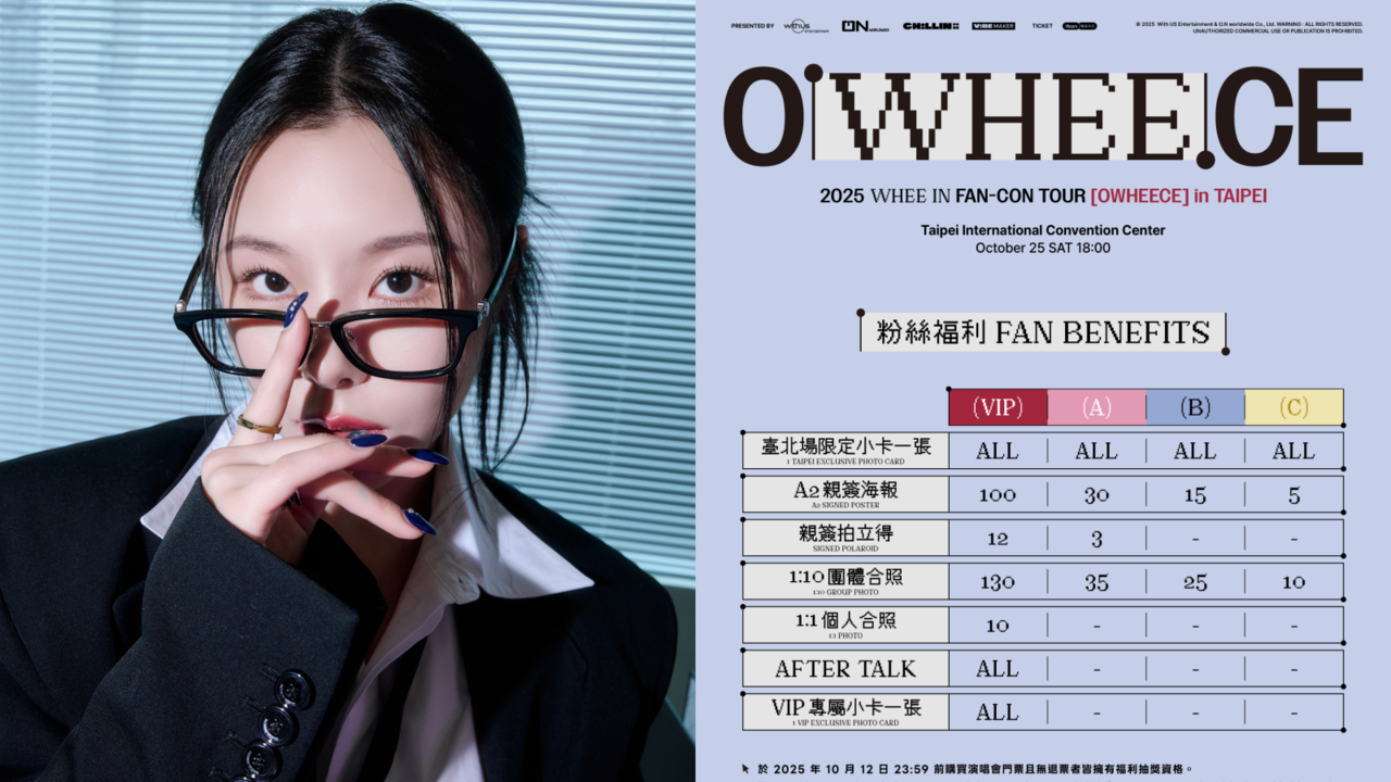 南韓歌手輝人時隔1年展開全新FAN-CON巡迴,海外首站即選定如自家「灶咖」般自在的臺灣,《2025 Whee In FAN-CON TOUR [OWHEECE] in TAIPEI》將於10月25日在臺北國際會議中心舉辦,演唱會門票將於8月30日上午11點在ibon售票網站開賣,採實名制購票。