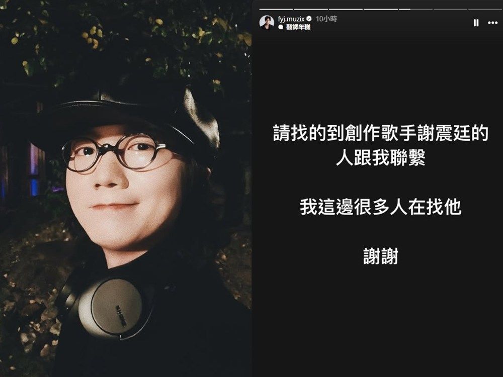 31歲創作歌手謝震廷驚傳失聯!他的歌手好友范揚景昨(21)日深夜,在社群平台發出緊急尋人啟事,向外界疾呼:「請如果有遇到創作歌手謝震廷的人請立即聯繫我!」並表示「我們這邊很多人在找他」,請求各界協助。