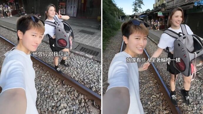 畫面中,可以看到鄭靚歆和老婆帶著毛小孩,一起驅車前往平溪後,在鐵軌上牽手自拍影片,還有放貓咪出來在鐵軌附近走走。未料,影片上傳不久後,馬上有網友提醒她,在平溪車站鐵軌上錄影是違法行為。