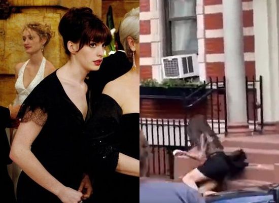 好萊塢女星安海瑟薇正在趕拍《穿著Prada的惡魔》,近日拍攝途中發生意外,當場從樓梯上摔下來,影片曝光後引發譁然。
