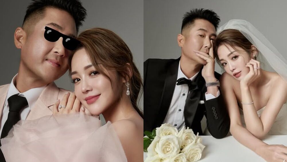 透過林千又分享的照片可見到,她身穿一件白色無肩帶婚紗,搭配長款頭紗,手上戴著鑽戒及手環,她微微把頭傾向老公,眼神直視鏡頭,露出甜美笑容。林千又的老公則穿著黑色西裝搭配襯衫及領結,用手半遮著嘴,夫妻倆一同靠近坐在桌前,桌上還擺著一束白色玫瑰花,整體氛圍相當浪漫。