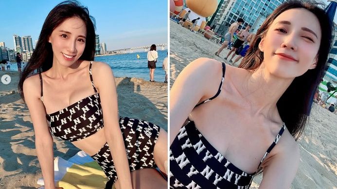 瑤瑤在釜山的一處海水浴場曬日光浴時,穿了一套黑白字母印花的泳裝,上半身是方領細肩帶短版設計,下半身則搭配高腰泳褲,不僅修飾腰腹線條,還散發出復古俐落的氛圍。