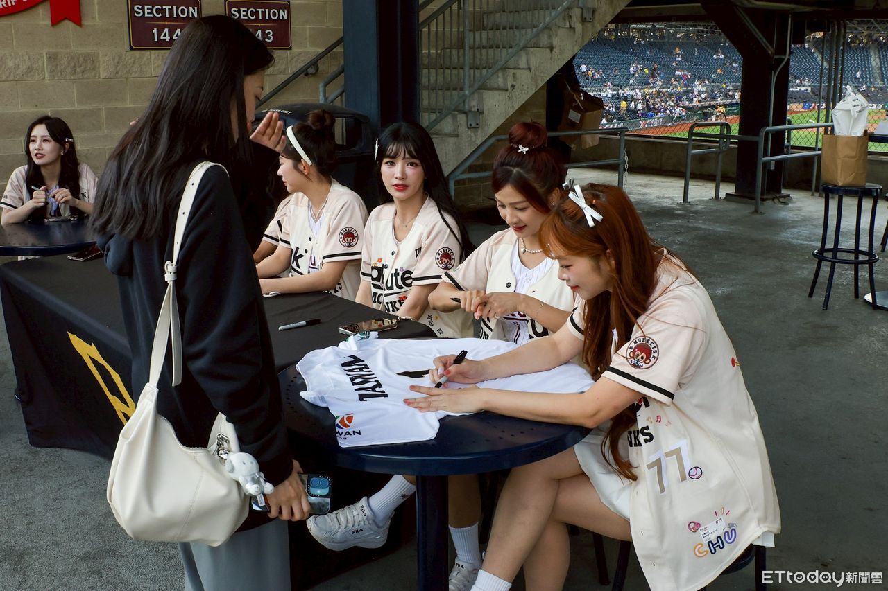 ▲樂天女孩在美國幫粉絲簽名。(圖/樂天桃猿)