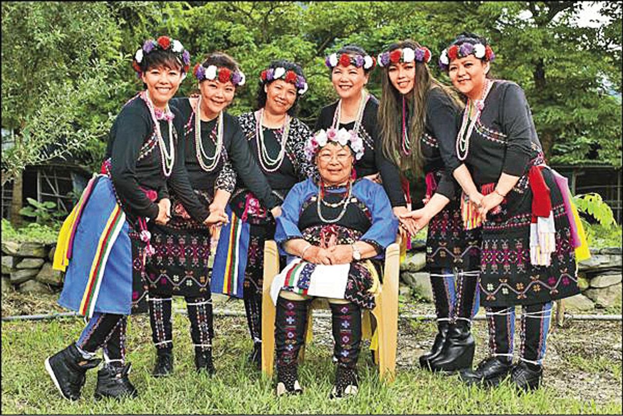 ▲張惠妹(後排右2)與媽媽(前)、家人們一起穿上卑南族服。(圖/野聲音提供)。