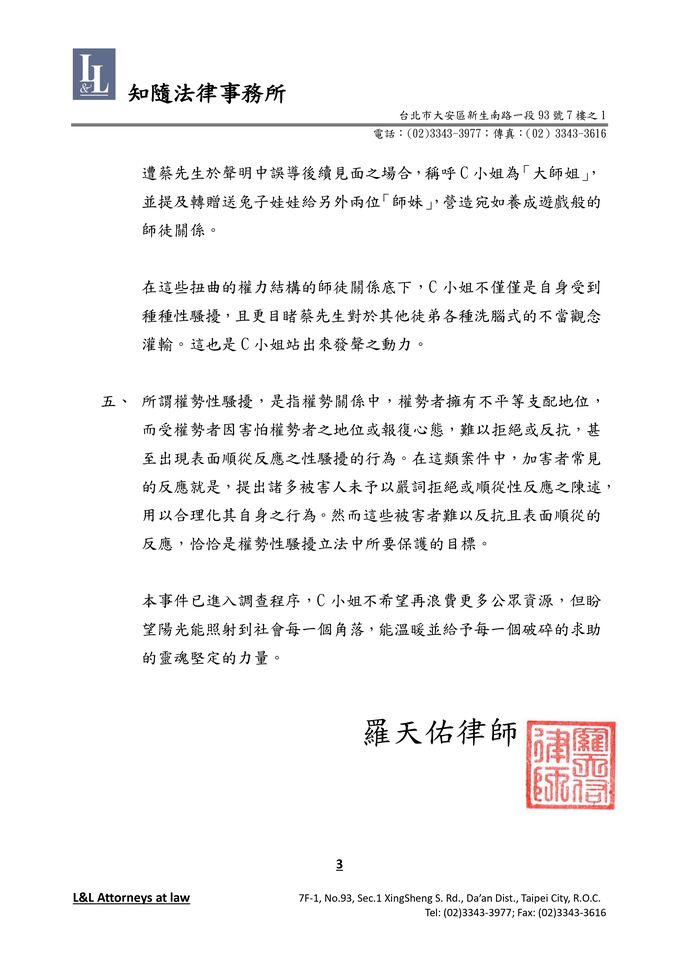 ▲C小姐透過律師,對蔡坤霖的喊冤作出聲明。(圖/羅天佑律師提供)