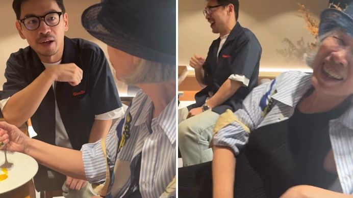 有趣的是,阿Ken仍不忘逗壽星開心,當場說了一個笑話,「you are cute哪一個字是可愛」,周杰倫媽媽不疑有他地說「當然是cute啊」,結果他一秒否定說「是you~」,逗得壽星笑到直推他的手臂。