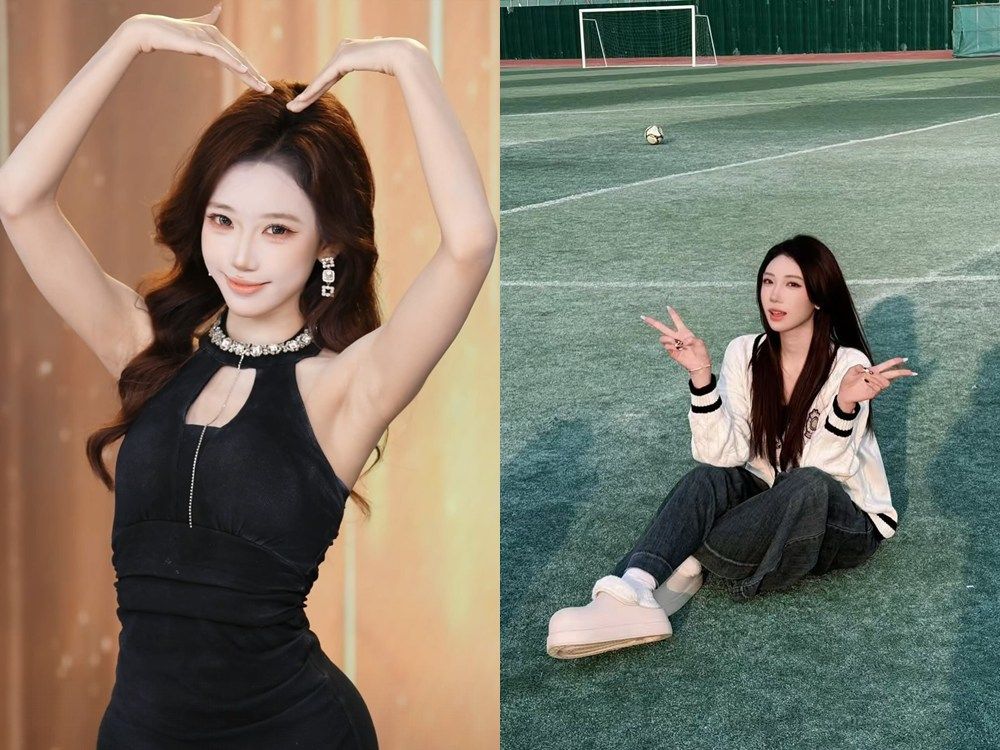 在曝光的照片中,「楓葉姐姐」身處一片綠茵足球場上,享受著午後陽光。她的穿搭風格與直播時截然不同,上半身穿著一件米白色的麻花針織開襟衫,搭配深色寬管牛仔褲與厚底麵包鞋,散發出滿滿的青春氣息。照片中的她,時而托腮對著鏡頭溫柔微笑,時而俏皮地比出YA手勢,模樣十分親切可人,展現了有別於舞台的鄰家女孩面貌。