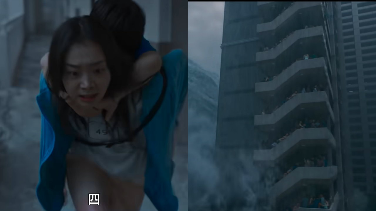 《巨洪》講述地球末日來臨,巨大洪水在一夕之間湧入公寓裡,金多美腳下全是水表情驚恐不已,下一秒公寓已成汪洋大海,她背著兒子逃亡,卻還是被埋沒在水裡,好不容易才浮出水面呼吸,面對末日絕望感、驚悚感拍得寫實,也讓觀眾看得很緊張。