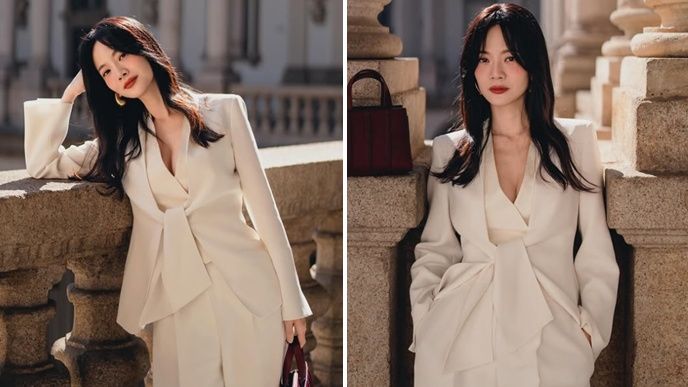 照片中,可以看到曾之喬以一套俐落的白色套裝亮相,上半身是深V領設計的西裝外套,大膽露出渾圓半球,深邃事業線全被看光;腰間自然收束,襯托出纖細腰身。