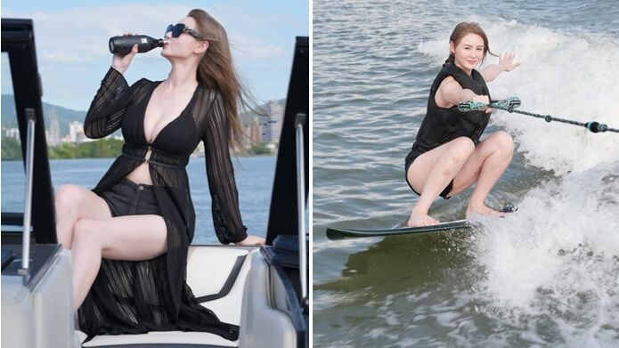 短今配戴大框墨鏡坐在小遊艇上,手中拿著黑色水壺,與全身黑色系造型相呼應。挑戰滑水時,她脫掉罩衫並穿上救生衣,自信地說「一定要成為浪上最美的花,不要再說我是AI了」!