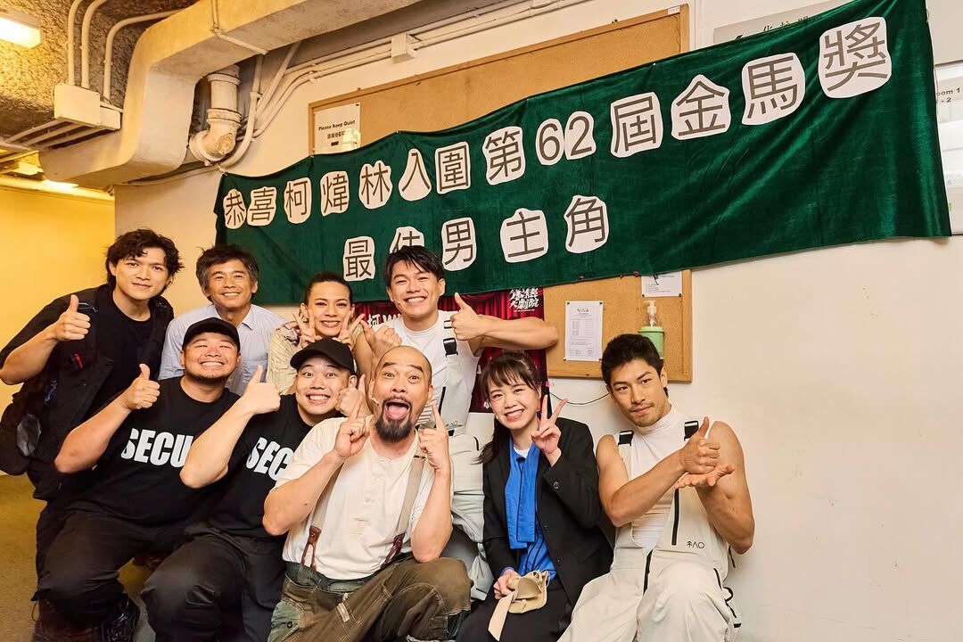 ▲金馬名單揭曉的當下,柯煒林(後排右一)正在舞台劇現場,一下台就已經有好友們準備的慶賀布條。(圖/翻攝自IG)