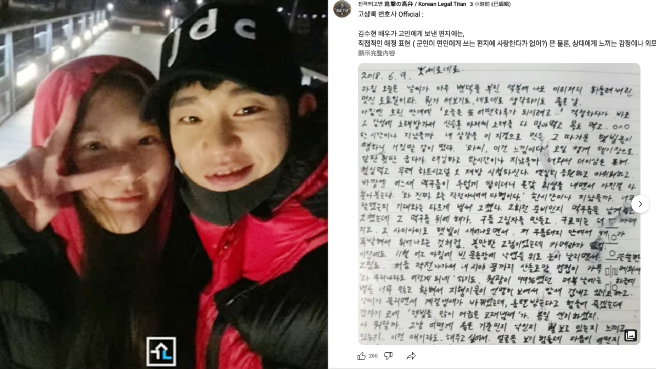 南韓男神金秀賢因爆出與未成年時期金賽綸交往引起爭議,他雖始終否認對方當時已經成年,但難挽回輿論,最終從螢光幕前淡出。直到近期,他的委任律師再度出面,連續多日反駁當時的證據,強調「橫豎研究所」以假亂真,照片明明是金賽綸成年,卻捏造成未成年,3日一早又拆解當時在軍中寄信給金賽綸的信件,強調此時兩人還沒交往,且字句裡沒有半句「我愛你」,不像是交往中的情侶。