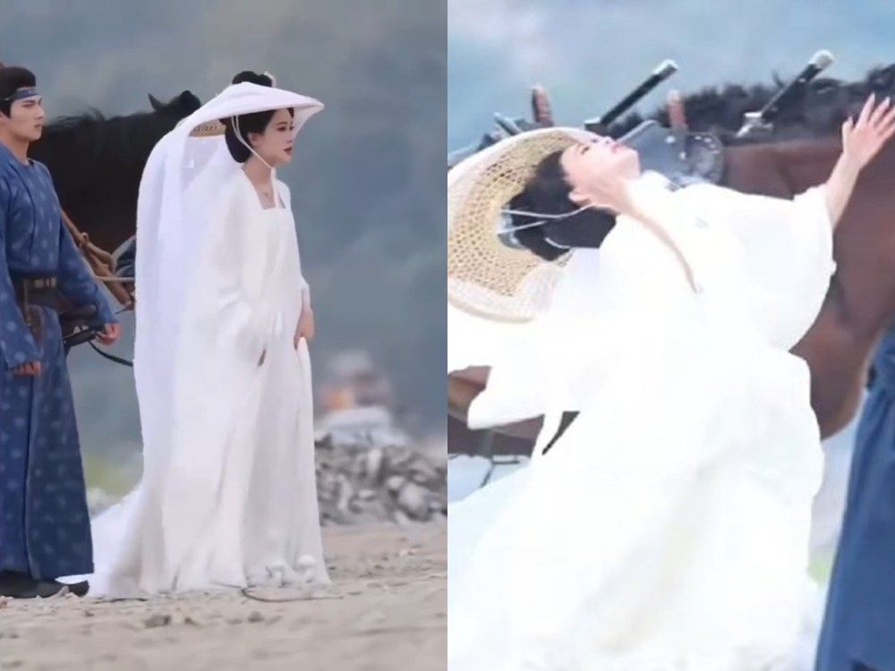 影片中,孟子義身穿一襲白色飄逸古裝、頭戴紗帽,正站在馬匹身邊,現場是一片沙地。而她頭上長長的帽紗垂到地面,沒注意到被後方的演員踩住,一旦開始往前跑時,被踩住的帽紗瞬間變成一條致命的繩索,猛力將她的頭部向後拉扯。失去平衡的她,整個人以一個「向後對折」的恐怖姿勢重重摔倒在地,頭部與頸部看起來受到劇烈拉扯,場面十分危險,而後方的演員也隨即趕上來攙扶。