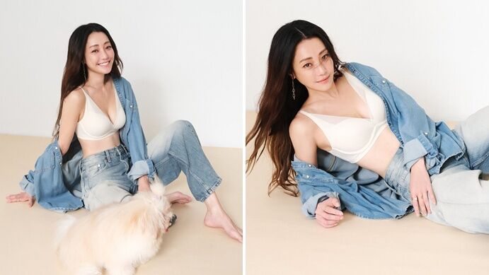 照片中,可以看到謝欣穎身穿米杏色內衣,半脫下淺色丹寧襯衫,營造出慵懶的性感氛圍。她下半身則搭配一條低腰、略帶水洗舊感的牛仔褲,大膽打開鈕扣露出內褲頭,展現出纖細腰線和平坦小腹。