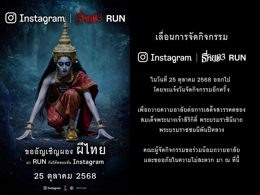 「鬼聲泣3路跑」是泰國影視集團Major Group與第3電視台、Instagram共同主辦的城市路跑活動,由於《鬼聲泣3》票房突破4億泰銖,因此規劃將曼谷變成充滿創意的恐怖地標,並邀請參與路跑者身穿泰國鬼怪服裝進行跑步拍攝打卡活動,電影男主角納得克釘宮(Nadech)在曼詩里水廠(舊址)起跑點現身,路跑活動主題是將曼谷化身鬼怪之城,且活動時間訂於晚上6點半到深夜12點,原本呼應即將到來的萬聖節,現在活動確定延期。泰國民眾大多都能理解,紛紛在留言區貼上王太后的照片哀悼。