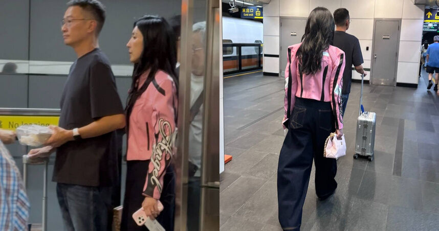 19日下午約2點45分,本刊讀者也在台北車站巧遇楊謹華與老公Ben,兩人正準備搭乘高鐵南下。只見楊謹華特意穿著黑色T恤搭配粉紅色外套、手提一只粉紅色香奈兒包包,就連手機殼也是粉色系,與BLACKPINK的應援色完美呼應,十分應景。