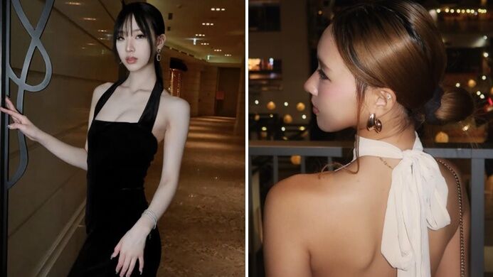 照片中,可以看到Elly身穿一件象牙白高領上衣,挖肩剪裁襯托出漂亮的肩頸線條。一轉身,她的衣服背後以蝴蝶結收束,露出一大半的光滑美背。
